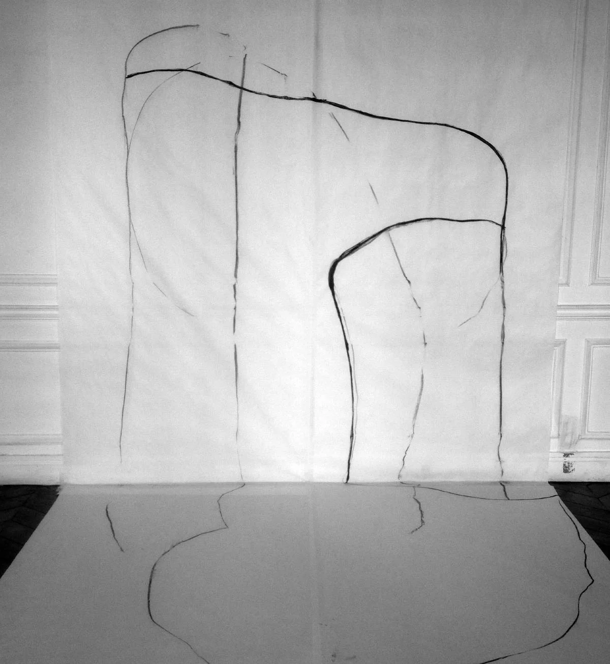 Dibuix de transferència d'etapa. (Tornant a un estat passat), 1971. "Quan passo un marcador al llarg de l'esquena d'Erik, ell intenta duplicar el moviment a la paret. La meva activitat estimula una resposta cinètica del seu sistema de memòria. Per tant, l’estic travessant. El retard sensorial o la desorientació constitueixen la discrepància entre dos dibuixos i es podrien veure com a elements que s'activen durant aquest procediment. Pel fet que Erik és la meva descendència i compartim ingredients biològics similars, la seva esquena (com a superfície) es pot veure com una versió immadura de la meva... en un sentit, faig contacte amb un estat passat."